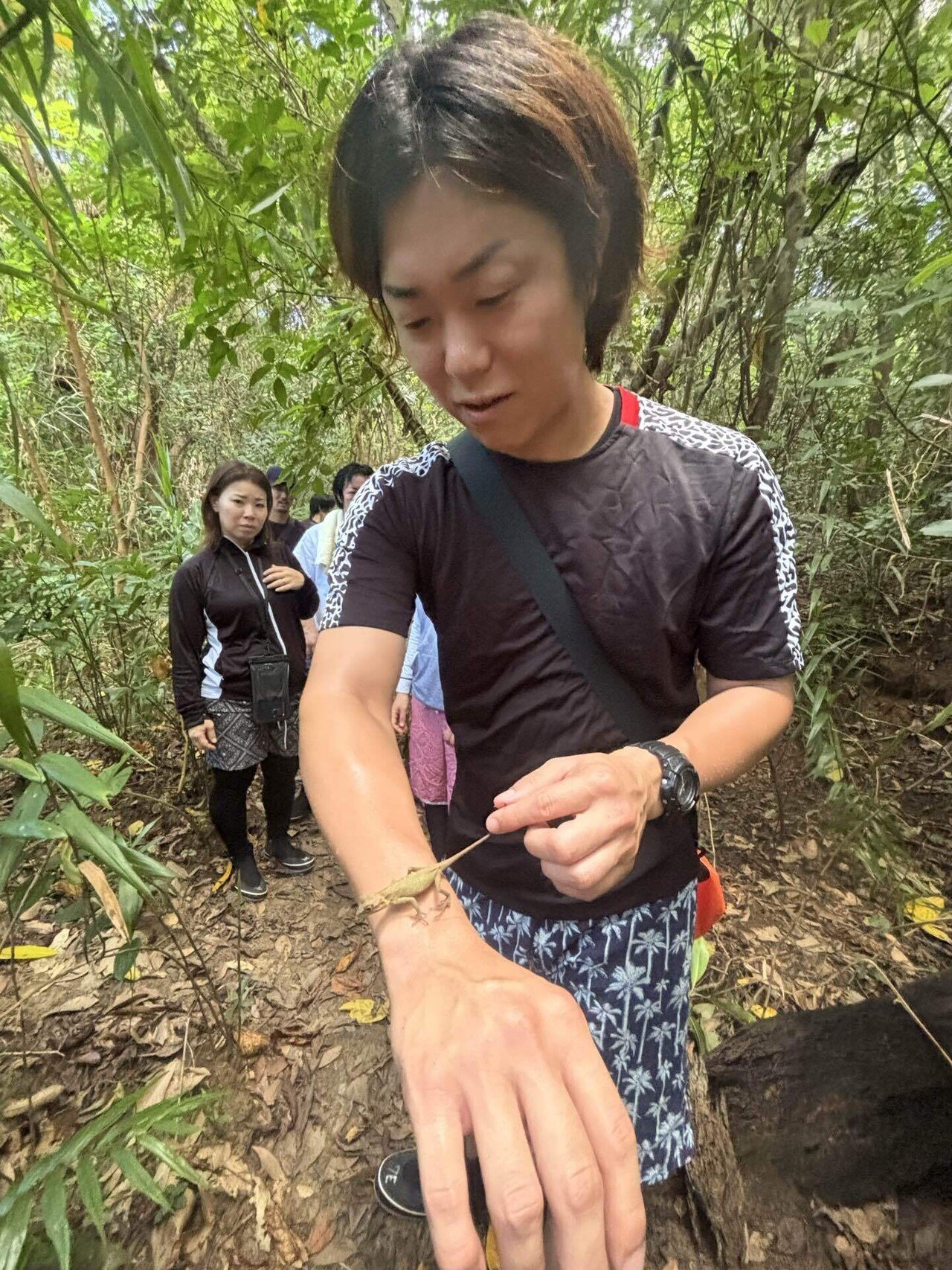 西表島のジャングルを進んでいると出会える“キノボリトカゲ”。尻尾を持っていれば安全に触れ合う事ができます。